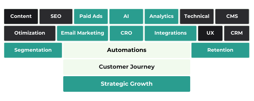 Pakume terviklikke lahendusi: alates turundusstrateegia loomisest ja klienditeekonna kaardistamisest kuni sihtrühma sügavama mõistmise ning vajalike tegevuste elluviimiseni. Kas otsid kindlat partnerit oma tiimi toetamiseks või iseseisvat eksperti protsessi juhtimiseks? Meie paindlik lähenemine tagab, et töötame täpselt nii, nagu sina vajad.